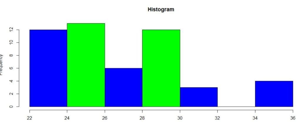 > hist(data,main=”Histogram”,col=c(“blue”,”green”))