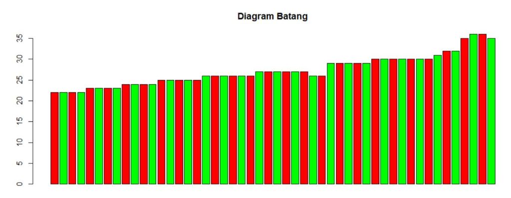 > barplot(data,main=”Diagram Batang”,col=c(“red”,”green”))