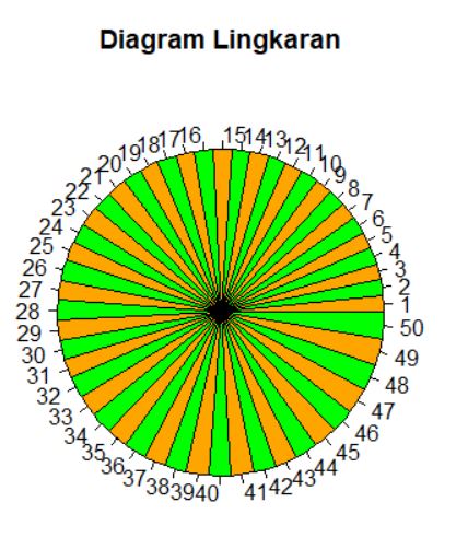 > pie(data,main=”Diagram Lingkaran”,col=c(“orange”,”green”))